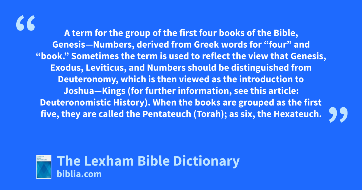 Tetrateuch A term for the group of the first four books of the Bible, Genesis—Numbers, derived from Greek words for “four” and “book.” Sometimes the term is used to reflect the view that Genesis, Exodus, Leviticus, and Numbers should be distinguished from Deuteronomy, which is then viewed as the introduction to Joshua—Kings (for further information, see this article: Deuteronomistic History). When the books are grouped as the first five, they are called the Pentateuch (Torah); as six, the Hexateuch.