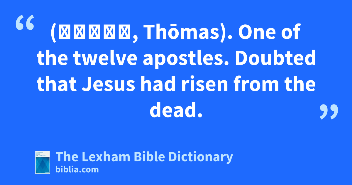 Thomas the Apostle (Θωμᾶς, Thōmas). One of the twelve apostles. Doubted that Jesus had risen from the dead.
