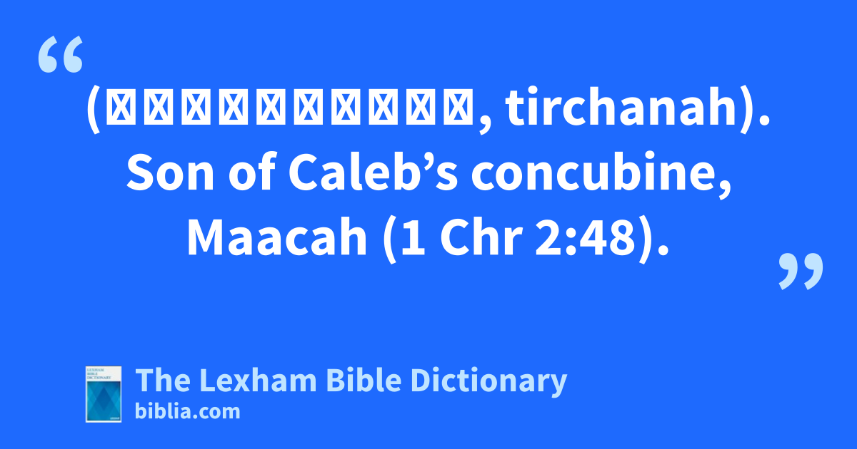 Tirhanah, Son of Caleb (תִּרְחֲנָה, tirchanah). Son of Caleb’s concubine, Maacah (1 Chr 2:48).