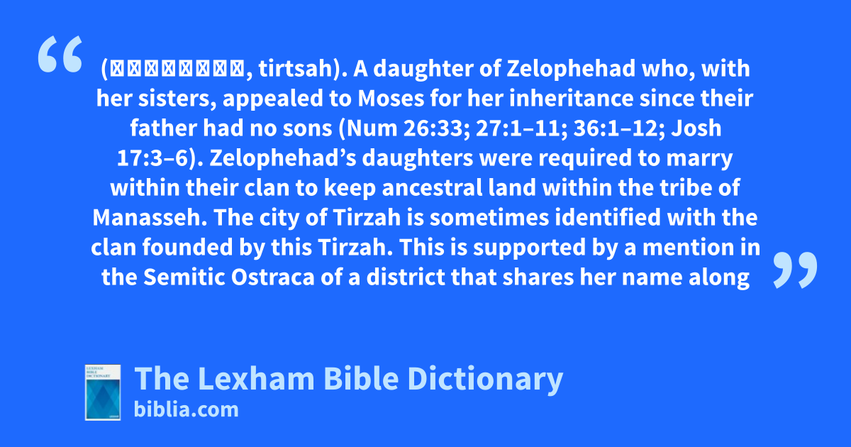 Tirzah, Daughter of Zelophehad (תִּרְצָה, tirtsah). A daughter of Zelophehad who, with her sisters, appealed to Moses for her inheritance since their father had no sons (Num 26:33; 27:1–11; 36:1–12; Josh 17:3–6). Zelophehad’s daughters were required to marry within their clan to keep ancestral land within the tribe of Manasseh. The city of Tirzah is sometimes identified with the clan founded by this Tirzah. This is supported by a mention in the Semitic Ostraca of a district that shares her name along with districts that could be named after several of her sisters (Noah and Hoglah).