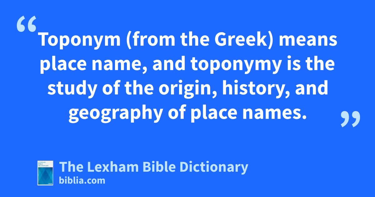 Toponyms and Toponymy Toponym (from the Greek) means place name, and toponymy is the study of the origin, history, and geography of place names.