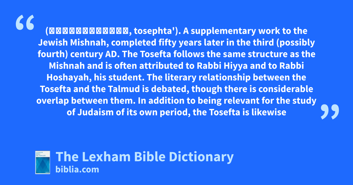 Tosefta (תּוֹסֶפְתָּא, tosephta'). A supplementary work to the Jewish Mishnah, completed fifty years later in the third (possibly fourth) century ad. The Tosefta follows the same structure as the Mishnah and is often attributed to Rabbi Hiyya and to Rabbi Hoshayah, his student. The literary relationship between the Tosefta and the Talmud is debated, though there is considerable overlap between them. In addition to being relevant for the study of Judaism of its own period, the Tosefta is likewise relevant to the study of Judaism in Jesus’ and the apostles’ lifetimes. For more information, see these articles: Talmud; Mishnah; Halakah.