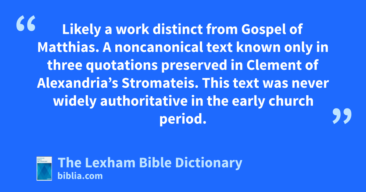 Traditions of Matthias Likely a work distinct from Gospel of Matthias. A noncanonical text known only in three quotations preserved in Clement of Alexandria’s Stromateis. This text was never widely authoritative in the early church period.