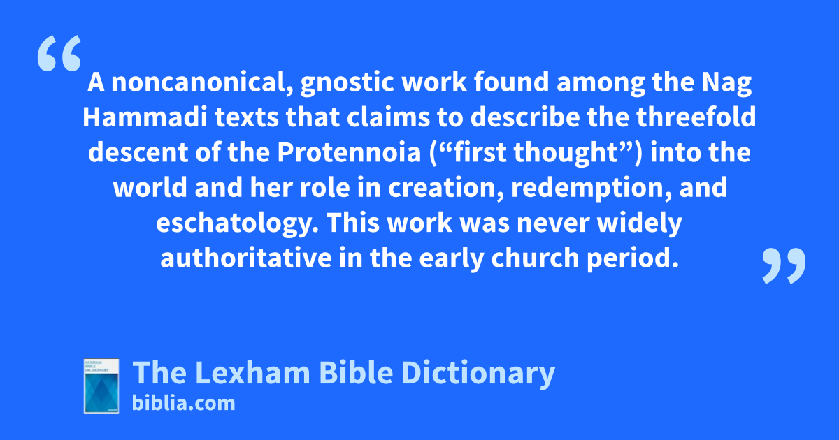 Trimorphic Protennoia A noncanonical, gnostic work found among the Nag Hammadi texts that claims to describe the threefold descent of the Protennoia (“first thought”) into the world and her role in creation, redemption, and eschatology. This work was never widely authoritative in the early church period.