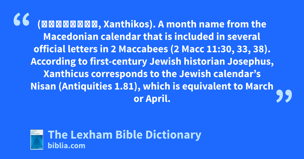 Xanthicus (Ξανθικός, Xanthikos). A month name from the Macedonian calendar that is included in several official letters in 2 Maccabees (2 Macc 11:30, 33, 38). According to first-century Jewish historian Josephus, Xanthicus corresponds to the Jewish calendar’s Nisan (Antiquities 1.81), which is equivalent to March or April.
