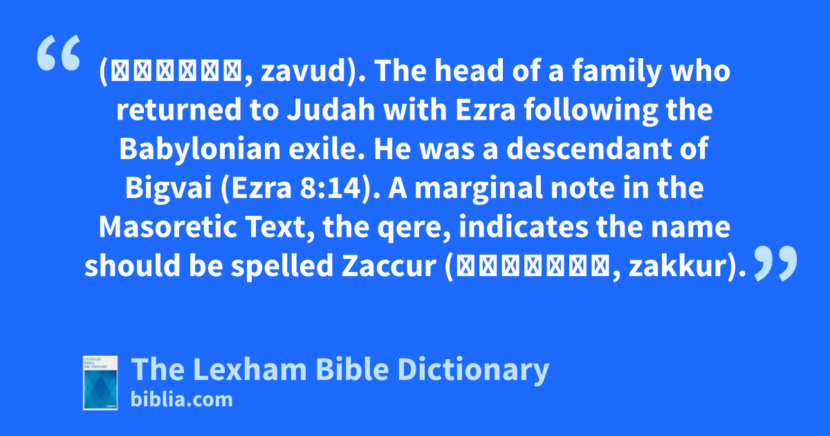 Zabud, Descendant of Bigvai (זָבוּד, zavud). The head of a family who returned to Judah with Ezra following the Babylonian exile. He was a descendant of Bigvai (Ezra 8:14). A marginal note in the Masoretic Text, the qere, indicates the name should be spelled Zaccur (זַכּוּר, zakkur).