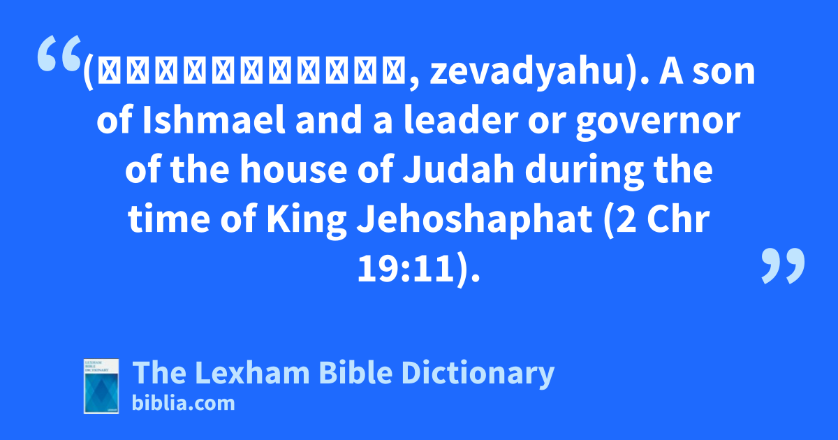 Zebadiah, Son of Ishmael (זְבַדְיָהוּ, zevadyahu). A son of Ishmael and a leader or governor of the house of Judah during the time of King Jehoshaphat (2 Chr 19:11).