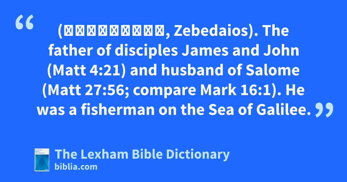 Zebedee (Ζεβεδαῖος, Zebedaios). The father of disciples James and John (Matt 4:21) and husband of Salome (Matt 27:56; compare Mark 16:1). He was a fisherman on the Sea of Galilee.