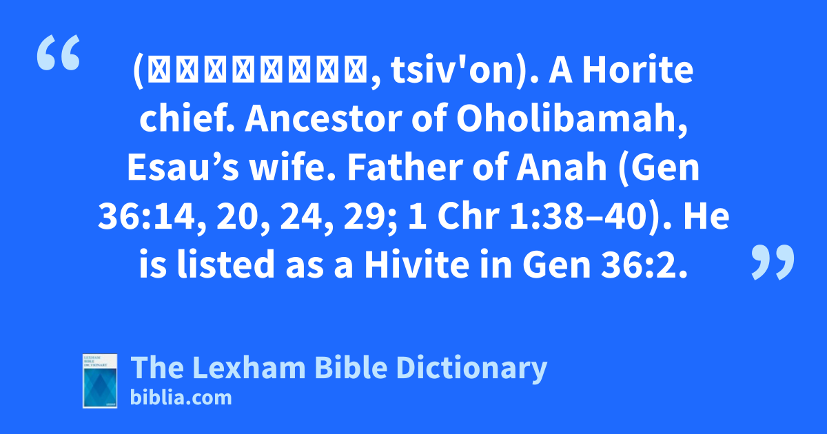 Zibeon, Son of Seir (צִבְעוֹן, tsiv'on). A Horite chief. Ancestor of Oholibamah, Esau’s wife. Father of Anah (Gen 36:14, 20, 24, 29; 1 Chr 1:38–40). He is listed as a Hivite in Gen 36:2.