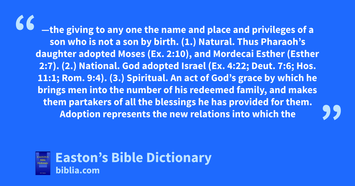(3.) Spiritual. An act of God’s grace by which he brings men into the number of his redeemed family, and makes them partakers of all the blessings he has provided for them. Adoption represents the new relations into which the believer is introduced by justification, and the privileges connected therewith, viz., an interest in God’s peculiar love (John 17:23; Rom. 5:5–8), a spiritual nature (2 Pet. 1:4; John 1:13), the possession of a spirit becoming children of God (1 Pet. 1:14; 2 John 4; Rom. 8:15–21; Gal. 5:1; Heb. 2:15), present protection, consolation, supplies (Luke 12:27–32; John 14:18; 1 Cor. 3:21–23; 2 Cor. 1:4), fatherly chastisements (Heb. 12:5–11), and a future glorious inheritance (Rom. 8:17, 23; James 2:5; Phil. 3:21).