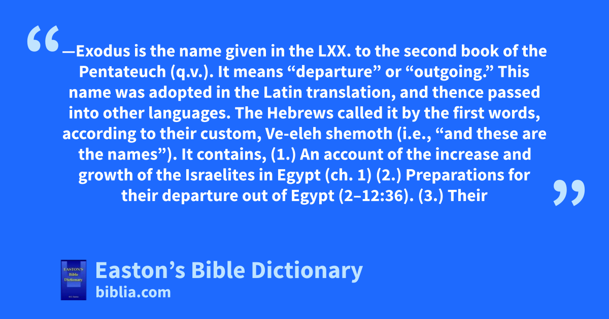 Exodus, Book of—Exodus is the name given in the LXX. to the second book of the Pentateuch (q.v.). It means “departure” or “outgoing.” This name was adopted in the Latin translation, and thence passed into other languages. The Hebrews called it by the first words, according to their custom, Ve-eleh shemoth (i.e., “and these are the names”).