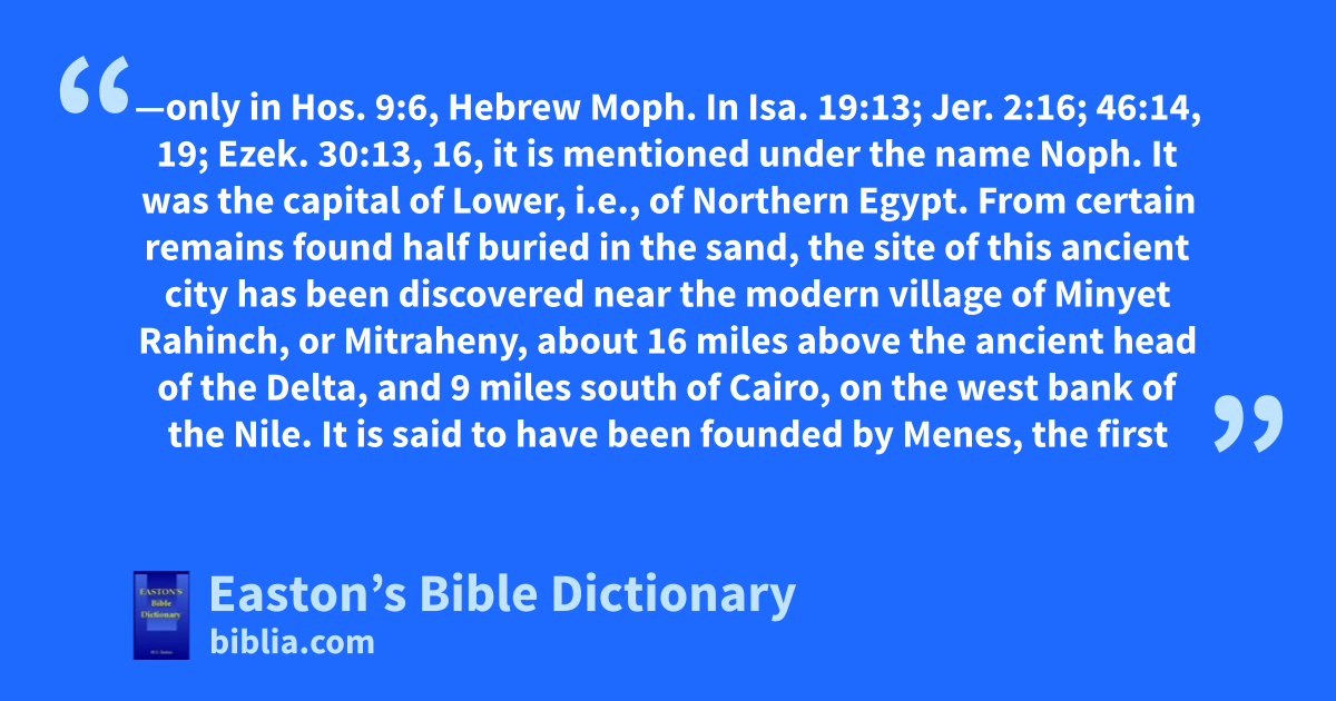 Memphis—only in Hos. 9:6, Hebrew Moph. In Isa. 19:13; Jer. 2:16; 46:14, 19; Ezek. 30:13, 16, it is mentioned under the name Noph. It was the capital of Lower, i.e., of Northern Egypt. From certain remains found half buried in the sand, the site of this ancient city has been discovered near the modern village of Minyet Rahinch, or Mitraheny, about 16 miles above the ancient head of the Delta, and 9 miles south of Cairo, on the west bank of the Nile. It is said to have been founded by Menes, the first king of Egypt, and to have been in circumference about 19 miles. “There are few remains above ground,” says Manning (The Land of the Pharaohs), “of the splendour of ancient Memphis. The city has utterly disappeared. If any traces yet exist, they are buried beneath the vast mounds of crumbling bricks and broken pottery which meet the eye in every direction. Near the village of Mitraheny is a colossal statue of Rameses the Great. It is apparently one of the two described by Herodotus and Diodorus as standing in front of the temple of Ptah. They were originally 50 feet in height. The one which remains, though mutilated, measures 48 feet. It is finely carved in limestone, which takes a high polish, and is evidently a portrait. It lies in a pit, which, during the inundation, is filled with water. As we gaze on this fallen and battered statue of the mighty conqueror who was probably contemporaneous with Moses, it is impossible not to remember the words of the prophet Isaiah, 19:13; 44:16–19, and Jeremiah, 46:19.”