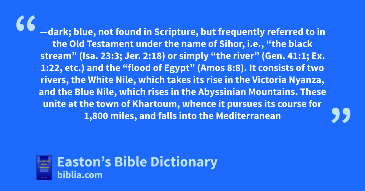 Nile—dark; blue, not found in Scripture, but frequently referred to in the Old Testament under the name of Sihor, i.e., “the black stream” (Isa. 23:3; Jer. 2:18) or simply “the river” (Gen. 41:1; Ex. 1:22, etc.) and the “flood of Egypt” (Amos 8:8). It consists of two rivers, the White Nile, which takes its rise in the Victoria Nyanza, and the Blue Nile, which rises in the Abyssinian Mountains. These unite at the town of Khartoum, whence it pursues its course for 1,800 miles, and falls into the Mediterranean through its two branches, into which it is divided a few miles north of Cairo, the Rosetta and the Damietta branch. (See EGYPT.)
