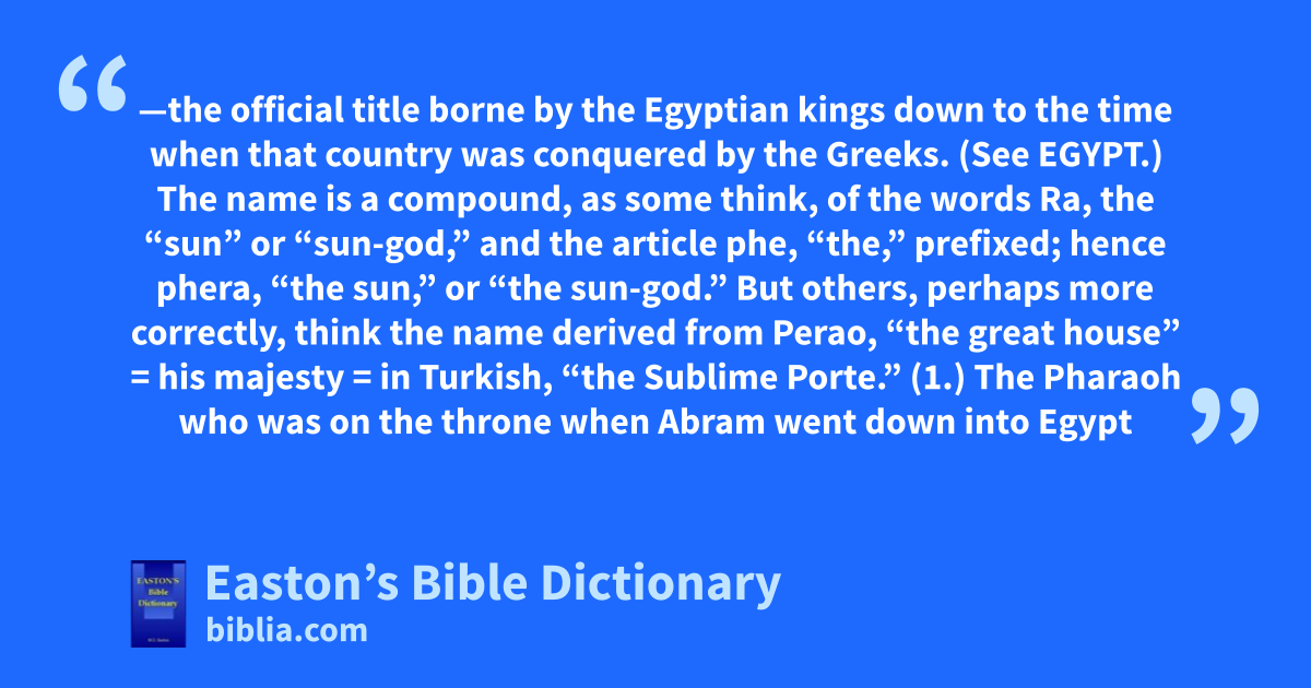 Pharaoh—the official title borne by the Egyptian kings down to the time when that country was conquered by the Greeks. (See EGYPT.) The name is a compound, as some think, of the words Ra, the “sun” or “sun-god,” and the article phe, “the,” prefixed; hence phera, “the sun,” or “the sun-god.” But others, perhaps more correctly, think the name derived from Perao, “the great house” = his majesty = in Turkish, “the Sublime Porte.”