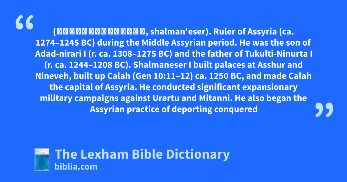 Shalmaneser I (שַׁלְמַנְאֶסֶר, shalman'eser). Ruler of Assyria (ca. 1274–1245 bc) during the Middle Assyrian period. He was the son of Adad-nirari I (r. ca. 1308–1275 bc) and the father of Tukulti-Ninurta I (r. ca. 1244–1208 bc).
