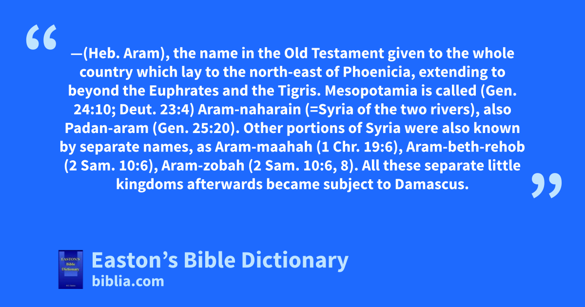 Syria—(Heb. Aram), the name in the Old Testament given to the whole country which lay to the north-east of Phoenicia, extending to beyond the Euphrates and the Tigris. Mesopotamia is called (Gen. 24:10; Deut. 23:4) Aram-naharain (=Syria of the two rivers), also Padan-aram (Gen. 25:20). Other portions of Syria were also known by separate names, as Aram-maahah (1 Chr. 19:6), Aram-beth-rehob (2 Sam. 10:6), Aram-zobah (2 Sam. 10:6, 8). All these separate little kingdoms afterwards became subject to Damascus. In the time of the Romans, Syria included also a part of Palestine and Asia Minor.