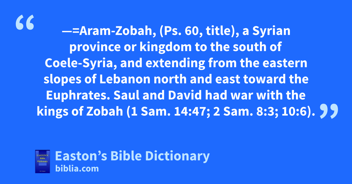 Zobah—=Aram-Zobah, (Ps. 60, title), a Syrian province or kingdom to the south of Coele-Syria, and extending from the eastern slopes of Lebanon north and east toward the Euphrates. Saul and David had war with the kings of Zobah (1 Sam. 14:47; 2 Sam. 8:3; 10:6).