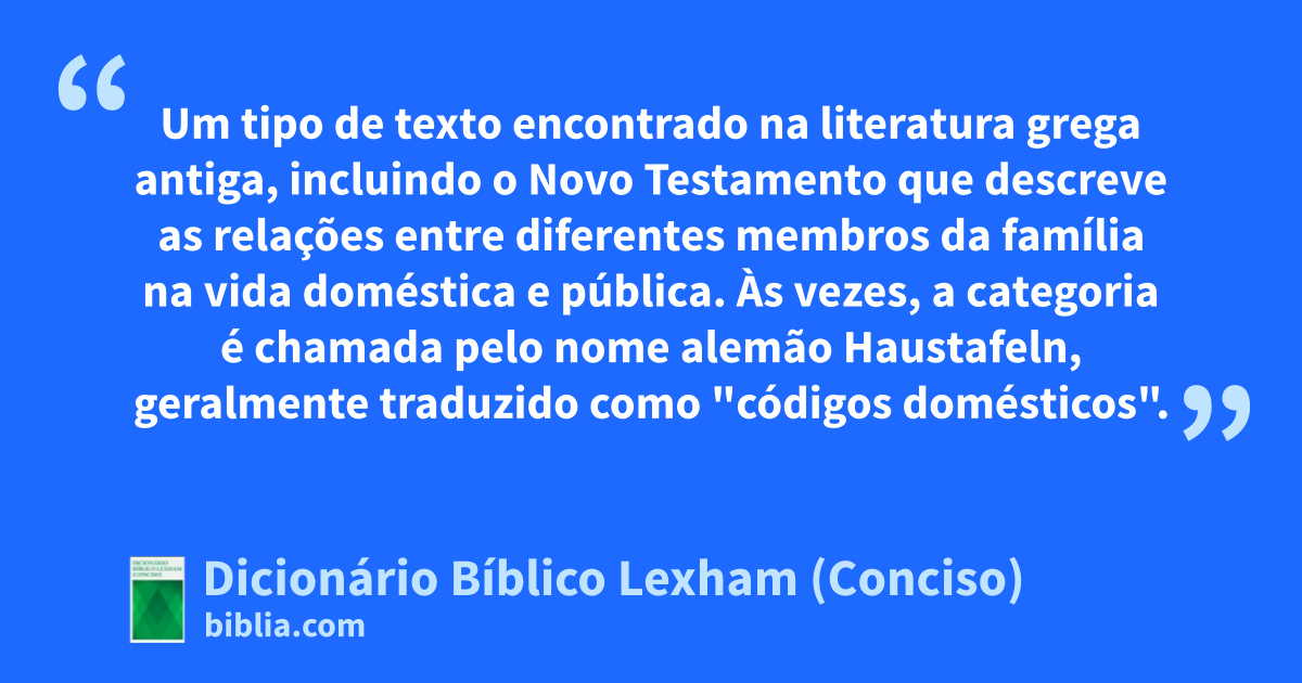 Códigos Domésticos Um tipo de texto encontrado na literatura grega antiga, incluindo o Novo Testamento que descreve as relações entre diferentes membros da família na vida doméstica e pública. Às vezes, a categoria é chamada pelo nome alemão Haustafeln, geralmente traduzido como "códigos domésticos".