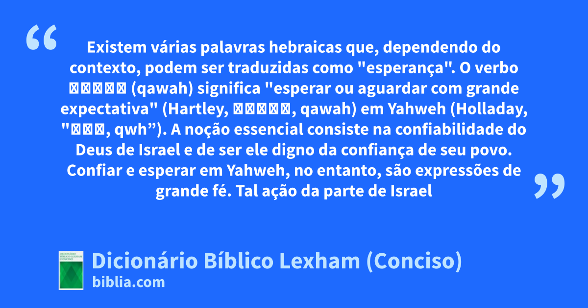 O verbo קָוָה (qawah) significa "esperar ou aguardar com grande expectativa" (Hartley, קָוָה, qawah) em Yahweh (Holladay, "קוה, qwh”). A noção essencial consiste na confiabilidade do Deus de Israel e de ser ele digno da confiança de seu povo. Confiar e esperar em Yahweh, no entanto, são expressões de grande fé. Tal ação da parte de Israel significa "perseverar com paciência na esperança confiante de que Deus agirá de modo decisivo pela salvação de seu povo" (Hartley, "קָוָה, qawah”;Gn 49:18; Is 49:23 ; Sl 37: 9).