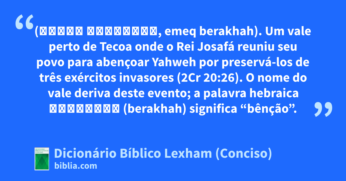Beraca, Vale de(עֵמֶק בְּרָכָה, emeq berakhah). Um vale perto de Tecoa onde o Rei Josafá reuniu seu povo para abençoar Yahweh por preservá-los de três exércitos invasores (2Cr 20:26). O nome do vale deriva deste evento; a palavra hebraica בְּרָכָה (berakhah) significa “bênção”.