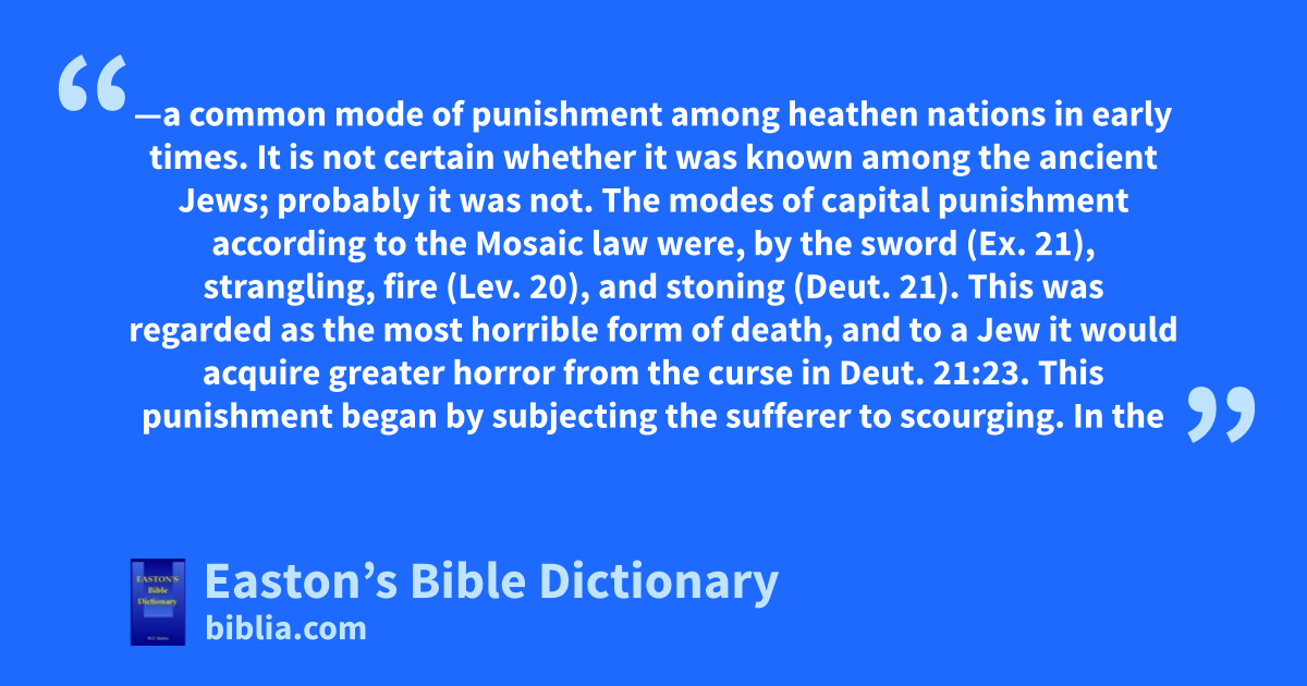 Crucifixion—a common mode of punishment among heathen nations in early times. It is not certain whether it was known among the ancient Jews; probably it was not. The modes of capital punishment according to the Mosaic law were, by the sword (Ex. 21), strangling, fire (Lev. 20), and stoning (Deut. 21).
