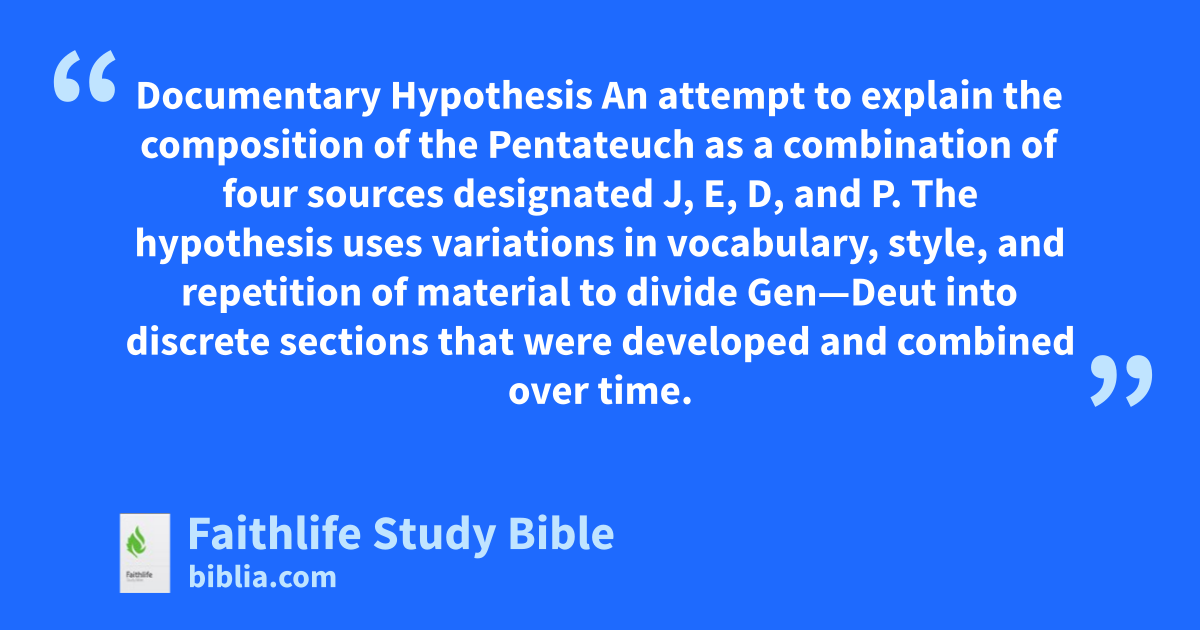 Documentary Hypothesis An attempt to explain the composition of the Pentateuch as a combination of four sources designated J, E, D, and P. The hypothesis uses variations in vocabulary, style, and repetition of material to divide Gen—Deut into discrete sections that were developed and combined over time.