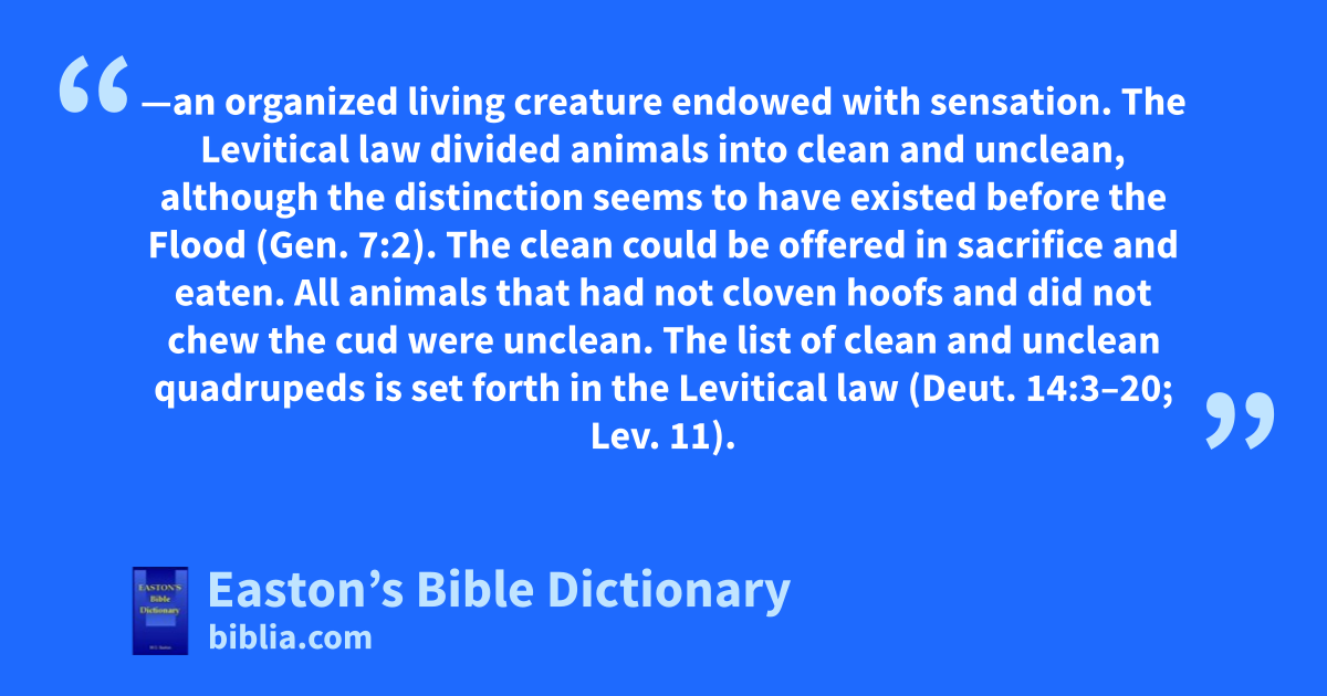 Animal—an organized living creature endowed with sensation. The Levitical law divided animals into clean and unclean, although the distinction seems to have existed before the Flood (Gen. 7:2). The clean could be offered in sacrifice and eaten. All animals that had not cloven hoofs and did not chew the cud were unclean. The list of clean and unclean quadrupeds is set forth in the Levitical law (Deut. 14:3–20; Lev. 11).
