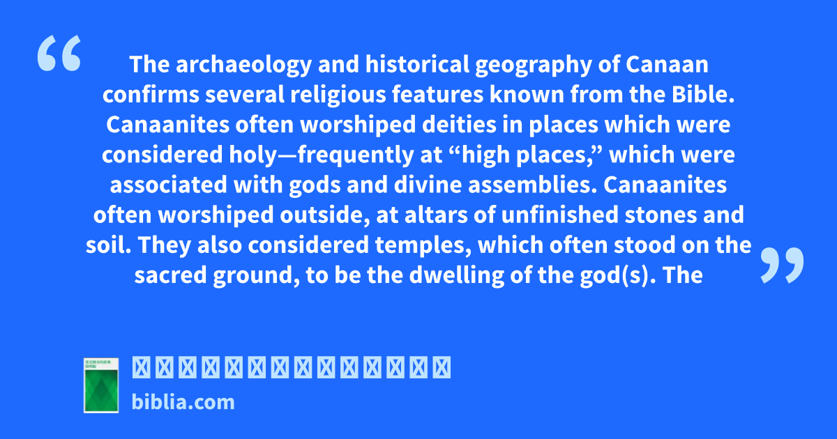 The archaeology and historical geography of Canaan confirms several religious features known from the Bible. Canaanites often worshiped deities in places which were considered holy—frequently at “high places,” which were associated with gods and divine assemblies. Canaanites often worshiped outside, at altars of unfinished stones and soil. They also considered temples, which often stood on the sacred ground, to be the dwelling of the god(s).