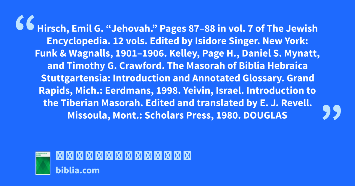 Hirsch, Emil G. “Jehovah.” Pages 87–88 in vol. 7 of The Jewish Encyclopedia. 12 vols. Edited by Isidore Singer. New York: Funk & Wagnalls, 1901–1906.