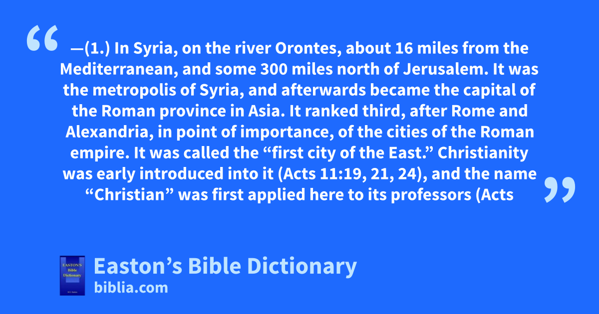 Antioch—(1.) In Syria, on the river Orontes, about 16 miles from the Mediterranean, and some 300 miles north of Jerusalem. It was the metropolis of Syria, and afterwards became the capital of the Roman province in Asia. It ranked third, after Rome and Alexandria, in point of importance, of the cities of the Roman empire. It was called the “first city of the East.” Christianity was early introduced into it (Acts 11:19, 21, 24), and the name “Christian” was first applied here to its professors (Acts 11:26). It is intimately connected with the early history of the gospel (Acts 6:5; 11:19, 27, 28, 30; 12:25; 15:22–35; Gal. 2:11, 12). It was the great central point whence missionaries to the Gentiles were sent forth. It was the birth-place of the famous Christian father Chrysostom, who died 407. It bears the modern name of Antakia, and is now a miserable, decaying Turkish town. Like Philippi, it was raised to the rank of a Roman colony. Such colonies were ruled by “praetors” (R.V. marg., Acts 16:20, 21).