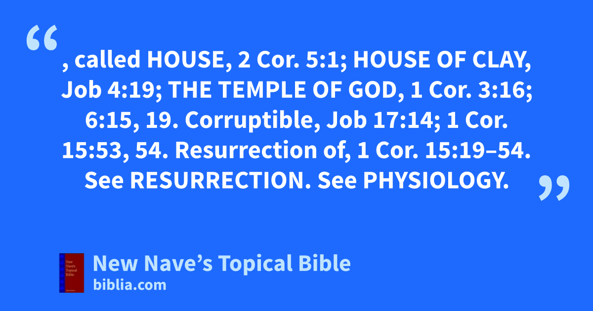 BODY, called House, 2 Cor. 5:1; House of Clay, Job 4:19; The Temple of God, 1 Cor. 3:16; 6:15, 19. Corruptible, Job 17:14; 1 Cor. 15:53, 54. Resurrection of, 1 Cor. 15:19–54. See Resurrection. See Physiology.