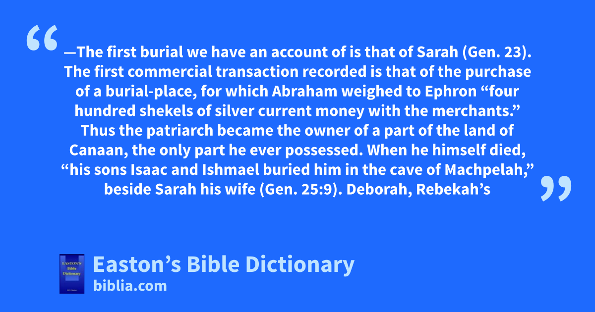 Deborah, Rebekah’s nurse, was buried under Allon-bachuth, “the oak of weeping” (Gen. 35:8), near to Bethel. Rachel died, and was buried near Ephrath; “and Jacob set a pillar upon her grave” (16–20). Isaac was buried at Hebron, where he had died (27, 29). Jacob, when charging his sons to bury him in the cave of Machpelah, said, “There they buried Abraham and Sarah his wife; there they buried Isaac and Rebekah his wife; and there I buried Leah” (49:31). In compliance with the oath which he made him swear unto him (47:29–31), Joseph, assisted by his brethren, buried Jacob in the cave of Machpelah (50:2, 13). At the Exodus, Moses “took the bones of Joseph with him,” and they were buried in the “parcel of ground” which Jacob had bought of the sons of Hamor (Josh. 24:32), which became Joseph’s inheritance (Gen. 48:22; 1 Chr. 5:1; John 4:5). Two burials are mentioned as having taken place in the wilderness. That of Miriam (Num. 20:1), and that of Moses, “in the land of Moab” (Deut. 34:5, 6, 8). There is no account of the actual burial of Aaron, which probably, however, took place on the summit of Mount Hor (Num. 20:28, 29).