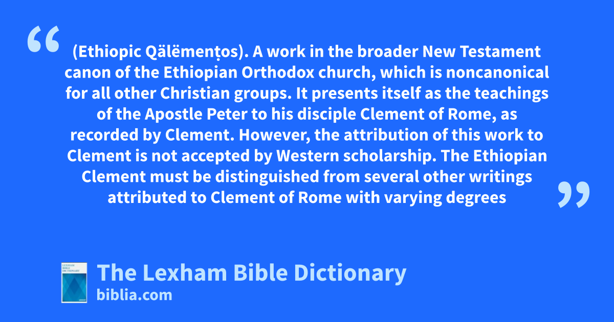 Clement, Ethiopian Book Of (Ethiopic Qälëmenṭos). A work in the broader New Testament canon of the Ethiopian Orthodox church, which is noncanonical for all other Christian groups. It presents itself as the teachings of the Apostle Peter to his disciple Clement of Rome, as recorded by Clement.