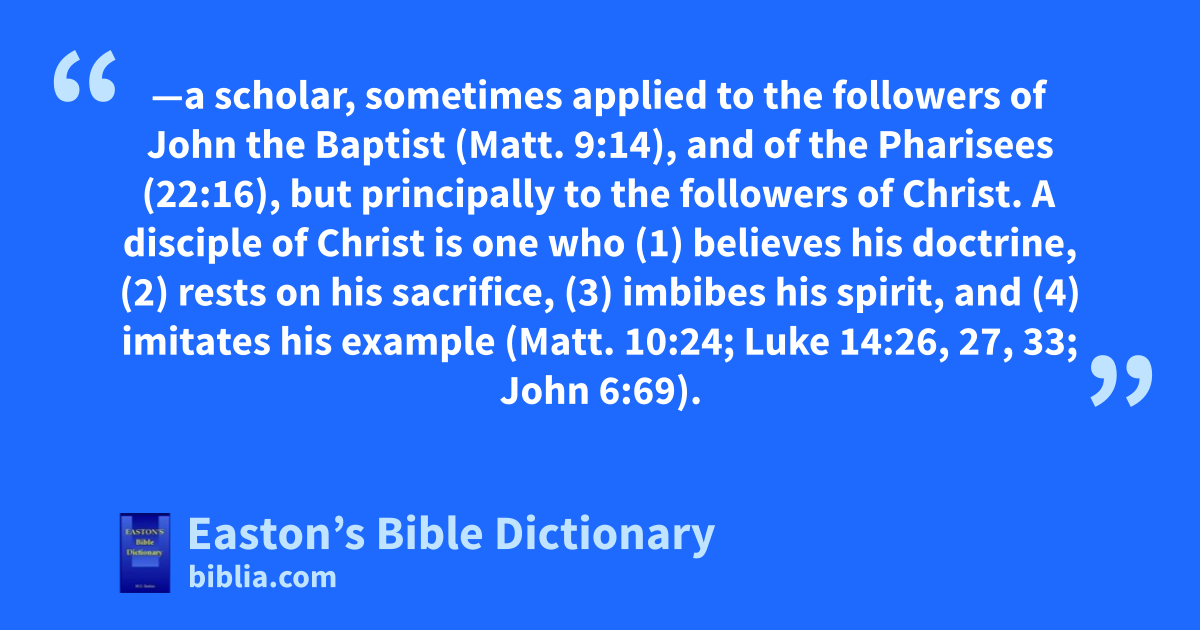 Disciple—a scholar, sometimes applied to the followers of John the Baptist (Matt. 9:14), and of the Pharisees (22:16), but principally to the followers of Christ. A disciple of Christ is one who (1) believes his doctrine, (2) rests on his sacrifice, (3) imbibes his spirit, and (4) imitates his example (Matt. 10:24; Luke 14:26, 27, 33; John 6:69).