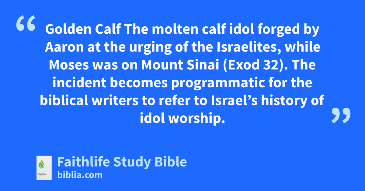 Golden Calf The molten calf idol forged by Aaron at the urging of the Israelites, while Moses was on Mount Sinai (Exod 32). The incident becomes programmatic for the biblical writers to refer to Israel’s history of idol worship.