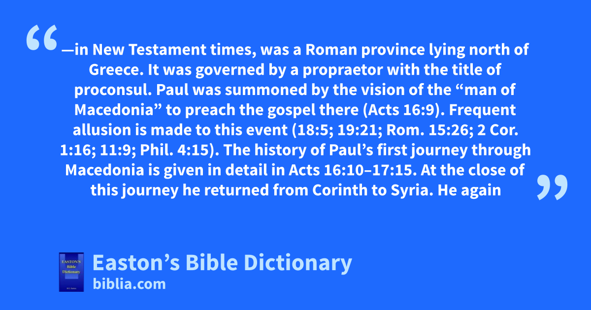 Macedonia—in New Testament times, was a Roman province lying north of Greece. It was governed by a propraetor with the title of proconsul. Paul was summoned by the vision of the “man of Macedonia” to preach the gospel there (Acts 16:9). Frequent allusion is made to this event (18:5; 19:21; Rom. 15:26; 2 Cor. 1:16; 11:9; Phil. 4:15). The history of Paul’s first journey through Macedonia is given in detail in Acts 16:10–17:15. At the close of this journey he returned from Corinth to Syria. He again passed through this country (20:1–6), although the details of the route are not given. After many years he probably visited it for a third time (Phil. 2:24; 1 Tim. 1:3). The first convert made by Paul in Europe was (Acts 16:13–15) Lydia (q.v.), a “seller of purple,” residing in Philippi, the chief city of the eastern division of Macedonia.