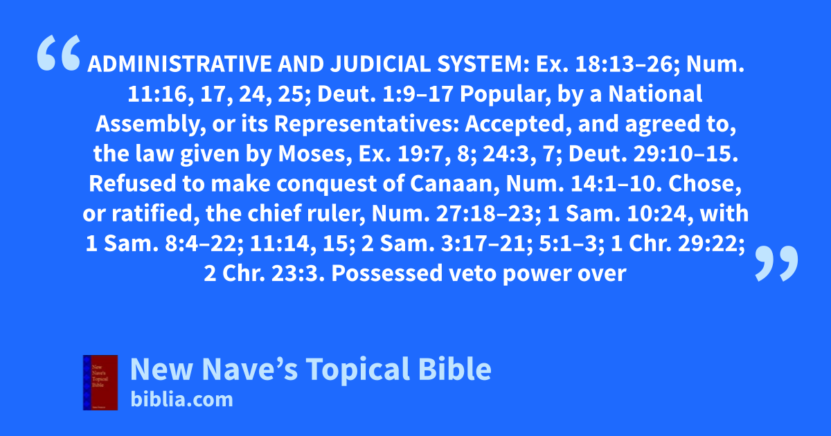 Mosaic: Administrative and Judicial System: Ex. 18:13–26; Num. 11:16, 17, 24, 25; Deut. 1:9–17 Popular, by a National Assembly, or its Representatives: Accepted, and agreed to, the law given by Moses, Ex. 19:7, 8; 24:3, 7; Deut. 29:10–15. Refused to make conquest of Canaan, Num. 14:1–10. Chose, or ratified, the chief ruler, Num. 27:18–23; 1 Sam. 10:24, with 1 Sam. 8:4–22; 11:14, 15; 2 Sam. 3:17–21; 5:1–3; 1 Chr. 29:22; 2 Chr. 23:3. Possessed veto power over the king’s purposes, 1 Sam. 14:44, 45. The court in certain capital cases, Num. 35:12, 24, 25. The Delegated, Senatorial Council: Closely associated with Moses and subsequent leaders, Ex. 3:16, 18; Ex. 4:29 [Ex. 12:21; 17:5, 6; 18:12; Lev. 9:1; Num. 16:25; Deut. 5:23.] Ex. 4:30, 31; Ex. 19:7, 8; Ex. 24:1, 14; Lev. 4:15; Num. 11:16–18, 30; Deut. 1:13–15; Deut. 27:1; Deut. 29:10–15; Deut. 31:9, 28; Josh. 7:6; Josh. 8:10, 32, 33; Josh. 23:2, 3, 6; Josh. 24:1, 24, 25; Judg. 21:16, 17 vs. 18–25.; Acts 5:17, 18, 21 with vs. 22–41. Miscellany of Facts Relating to the Senate: Demands a king, 1 Sam. 8:4–10, 19–22. Saul pleads to be honored before, 1 Sam. 15:30. Chooses David as king, 2 Sam. 3:17–21; 5:3; 1 Chr. 11:3. Closely associated with David, 2 Sam. 12:17; 1 Chr. 15:25; 21:16. Joins Absalom in his usurpation, 2 Sam. 17:4. David rebukes, 2 Sam. 19:11. Assists Solomon at the dedication of the temple, 1 Kin. 8:1–3; 2 Chr. 5:2–4. Counsels king Rehoboam, 1 Kin. 12:6–8, 13. Counsels king Ahab, 1 Kin. 20:7, 8. Josiah assembles to hear the law of the Lord, 2 Kin. 23:1; 2 Chr. 34:29, 31. Legislates with Ezra in reforming certain marriages with the heathen, Ezra 9:1; 10:8–14. Legislates in later times, Matt. 15:2, 7–9; Mark 7:1–13. Sits as a court, Jer. 26:10–24. Constitutes, with priests and scribes, a court for the trial of both civil and ecclesiastical causes, Matt. 21:23; 26:3–5, 57–68; 27:1, 2; Mark 8:31; 14:43–65; 15:1; Luke 22:52–71; Acts 4:1–21; 6:9–15; 7:1–59. Unfaithful to the city, Lam. 1:19. Seeks counsel from prophets, Ezek. 8:1; 14:1; 20:1, 3; Joel 1:14; 2:16. Corrupt, 1 Kin. 21:8–14; Ezek. 8:11, 12; Matt. 26:14, 15; with chapter 27:3, 4. A similar senate existed among the Egyptians, Gen. 50:7, with Gen. 41:37, 38; Ex. 10:1, 7; 12:30; 14:5; and among the Midianites and Moabites, Num. 22:4, 7, and Gibeonites, Josh. 9:11. Executive Officers of Tribes and Cities, called Princes or Nobles, Members of the National Assembly, Num. 1:4–16, 44; 7:2, 3, 10, 11, 18, 24, 54, 84; 10:4; 16:2; 17:2, 6; 27:2; 31:13, 14; 32:2; 34:18–29; 36:1; Josh. 9:15–21; 17:4; 22:13–32; 1 Kin. 21:11–13; Neh. 3:9, 12, 16, 18, 19. The Mosaic Judicial System. See Court; Judge; Priest; Levite; Ruler; Sanhedrin; Synagogue. Forms and facts of government after the death of Moses and the princes who survived Moses. See Israel, History of, under the sub-topics Under the Judges; Under the Kings.