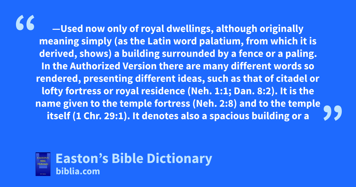 Palace—Used now only of royal dwellings, although originally meaning simply (as the Latin word palatium, from which it is derived, shows) a building surrounded by a fence or a paling. In the Authorized Version there are many different words so rendered, presenting different ideas, such as that of citadel or lofty fortress or royal residence (Neh. 1:1; Dan. 8:2). It is the name given to the temple fortress (Neh. 2:8) and to the temple itself (1 Chr. 29:1). It denotes also a spacious building or a great house (Dan. 1:4; 4:4, 29: Esther 1:5; 7:7), and a fortified place or an enclosure (Ezek. 25:4). Solomon’s palace is described in 1 Kings 7:1–12 as a series of buildings rather than a single great structure. Thirteen years were spent in their erection. This palace stood on the eastern hill, adjoining the temple on the south.