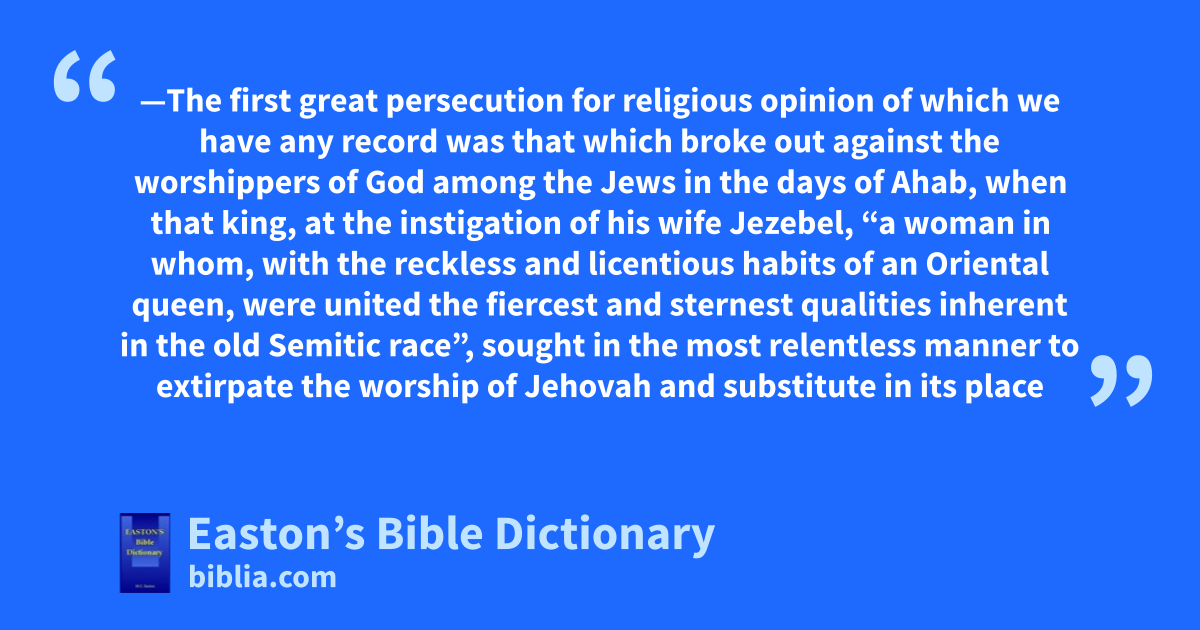 Persecution—The first great persecution for religious opinion of which we have any record was that which broke out against the worshippers of God among the Jews in the days of Ahab, when that king, at the instigation of his wife Jezebel, “a woman in whom, with the reckless and licentious habits of an Oriental queen, were united the fiercest and sternest qualities inherent in the old Semitic race”, sought in the most relentless manner to extirpate the worship of Jehovah and substitute in its place the worship of Ashtoreth and Baal. Ahab’s example in this respect was followed by Manasseh, who “shed innocent blood very much, till he had filled Jerusalem from one end to another” (2 Kings 21:16; comp. 24:4). In all ages, in one form or another, the people of God have had to suffer persecution. In its earliest history the Christian church passed through many bloody persecutions. Of subsequent centuries in our own and in other lands the same sad record may be made.