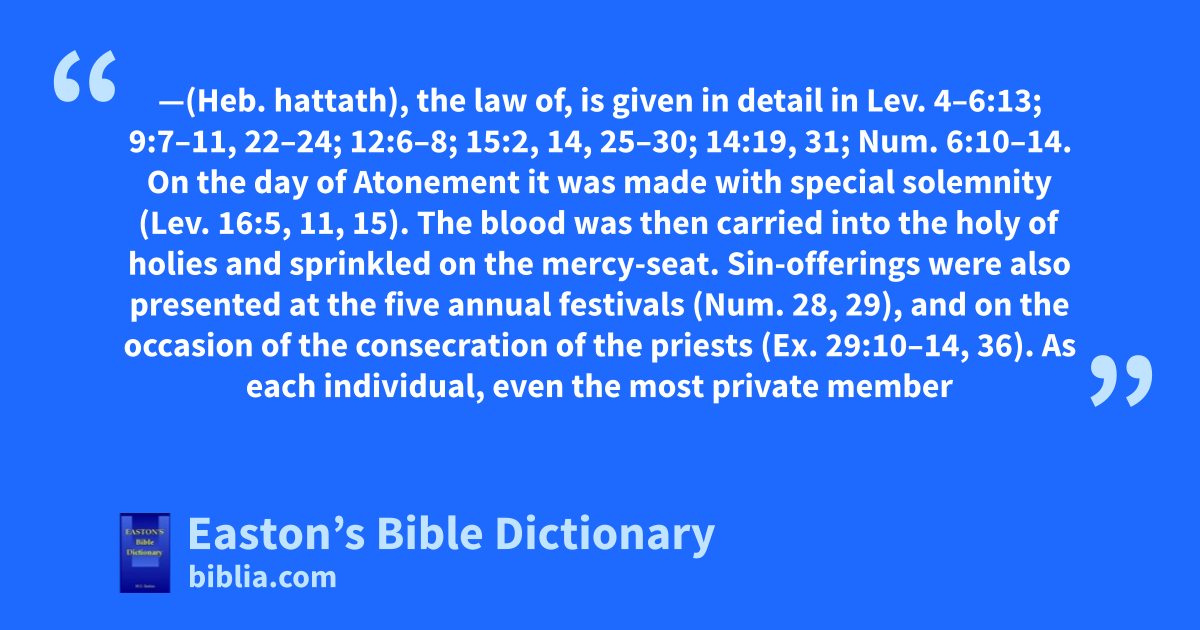 Sin-offering—(Heb. hattath), the law of, is given in detail in Lev. 4–6:13; 9:7–11, 22–24; 12:6–8; 15:2, 14, 25–30; 14:19, 31; Num. 6:10–14. On the day of Atonement it was made with special solemnity (Lev. 16:5, 11, 15). The blood was then carried into the holy of holies and sprinkled on the mercy-seat. Sin-offerings were also presented at the five annual festivals (Num. 28, 29), and on the occasion of the consecration of the priests (Ex. 29:10–14, 36). As each individual, even the most private member of the congregation, as well as the congregation at large, and the high priest, was obliged, on being convicted by his conscience of any particular sin, to come with a sin-offering, we see thus impressively disclosed the need in which every sinner stands of the salvation of Christ, and the necessity of making application to it as often as the guilt of sin renews itself upon his conscience. This resort of faith to the perfect sacrifice of Christ is the one way that lies open for the sinner’s attainment of pardon and restoration to peace. And then in the sacrifice itself there is the reality of that incomparable worth and preciousness which were so significantly represented in the sin-offering by the sacredness of its blood and the hallowed destination of its flesh. With reference to this the blood of Christ is called emphatically “the precious blood,” and the blood that “cleanseth from all sin” (1 John 1:7).