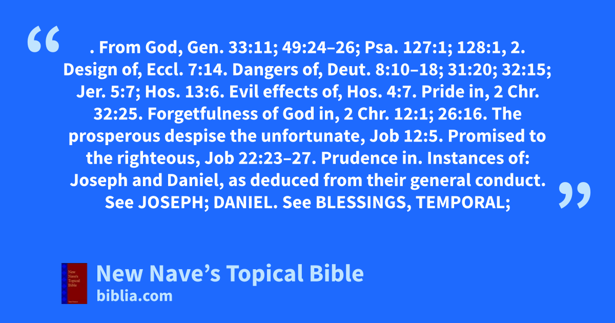 PROSPERITY. From God, Gen. 33:11; 49:24–26; Psa. 127:1; 128:1, 2. Design of, Eccl. 7:14. Dangers of, Deut. 8:10–18; 31:20; 32:15; Jer. 5:7; Hos. 13:6. Evil effects of, Hos. 4:7. Pride in, 2 Chr. 32:25. Forgetfulness of God in, 2 Chr. 12:1; 26:16. The prosperous despise the unfortunate, Job 12:5. Promised to the righteous, Job 22:23–27. Prudence in. Instances of: Joseph and Daniel, as deduced from their general conduct. See Joseph; Daniel. See Blessings, Temporal; Rich, The; Riches.