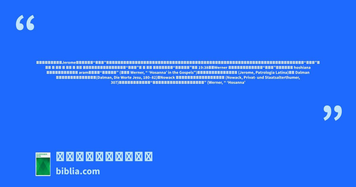 此外 , 馬太 , 馬可 和 約翰 描述當耶穌凱旋進城時,人們高喊“和散那”, 而 路加 記錄了人們高喊“應當稱頌的”(路 19:38)。Werner 等人甚至認為,福音書中的“和散那”可能不是源自 hoshiana ,而是源自一個單獨的詞 aram,意思是“能力與力量” (請參閱 Werner, “ ‘Hosanna’ in the Gospels”)。耶柔米認為和散那是一種稱呼 (Jerome, Patrologia Latina),而 Dalman 則認為它是一種表達敬意的方法(Dalman, Die Worte Jesu, 180–82)。Nowack 對此表達不同意,說它一定是一種祈求 (Nowack, Privat- und Staatsalterthumer, 307)。無論該詞的起源如何,“它必定傳達了一種關於彌賽亞的特殊意義” (Werner, “ ‘Hosanna’ in the Gospels,” 101–06)。