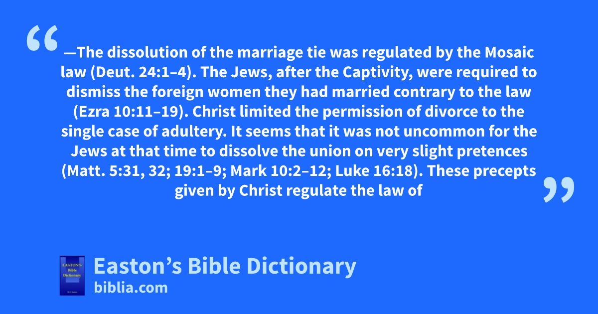 Divorce—The dissolution of the marriage tie was regulated by the Mosaic law (Deut. 24:1–4). The Jews, after the Captivity, were required to dismiss the foreign women they had married contrary to the law (Ezra 10:11–19). Christ limited the permission of divorce to the single case of adultery. It seems that it was not uncommon for the Jews at that time to dissolve the union on very slight pretences (Matt. 5:31, 32; 19:1–9; Mark 10:2–12; Luke 16:18). These precepts given by Christ regulate the law of divorce in the Christian Church.