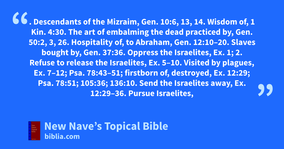 EGYPTIANS. Descendants of the Mizraim, Gen. 10:6, 13, 14. Wisdom of, 1 Kin. 4:30. The art of embalming the dead practiced by, Gen. 50:2, 3, 26. Hospitality of, to Abraham, Gen. 12:10–20. Slaves bought by, Gen. 37:36. Oppress the Israelites, Ex. 1; 2. Refuse to release the Israelites, Ex. 5–10. Visited by plagues, Ex. 7–12; Psa. 78:43–51; firstborn of, destroyed, Ex. 12:29; Psa. 78:51; 105:36; 136:10. Send the Israelites away, Ex. 12:29–36. Pursue Israelites, and the army of, destroyed, Ex. 14:5–30; Psa. 106:11; Heb. 11:29. Abhorred shepherds, Gen. 46:34. Refused to eat with Hebrews, Gen. 43:32. Alliances with, forbidden to the Israelites, Isa. 30:2; 31:1; 36:6; Ezek. 17:15; 29:6. Eligible to membership in Israelite congregation in the third generation, Deut. 23:7, 8. Invade the land of Israel: Under Shishak, 1 Kin. 14:25, 26; 2 Chr. 12:2–9; Pharaoh-nechoh, 2 Kin. 23:29–35; 2 Chr. 35:20–24; 36:3, 4. Aid the Israelites against the Chaldeans, Jer. 37:5–11. Intermarry with the Jews, 1 Kin. 3:1. An enthusiastic Egyptian instigated rebellion against Roman government, Acts 21:38. Prophecies of dispersion and restoration of, Ezek. 29:12–15; 30:23, 26. Conversion of, foretold, Isa. 19:18. See Egypt.