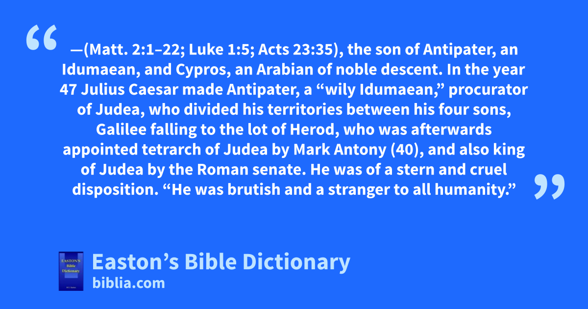 Herod the Great—(Matt. 2:1–22; Luke 1:5; Acts 23:35), the son of Antipater, an Idumaean, and Cypros, an Arabian of noble descent. In the year 47 Julius Caesar made Antipater, a “wily Idumaean,” procurator of Judea, who divided his territories between his four sons, Galilee falling to the lot of Herod, who was afterwards appointed tetrarch of Judea by Mark Antony (40), and also king of Judea by the Roman senate.