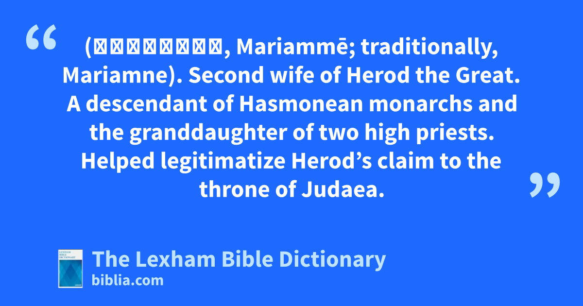 Mariamme I, Wife of Herod (Μαριάμμη, Mariammē; traditionally, Mariamne). Second wife of Herod the Great. A descendant of Hasmonean monarchs and the granddaughter of two high priests. Helped legitimatize Herod’s claim to the throne of Judaea.
