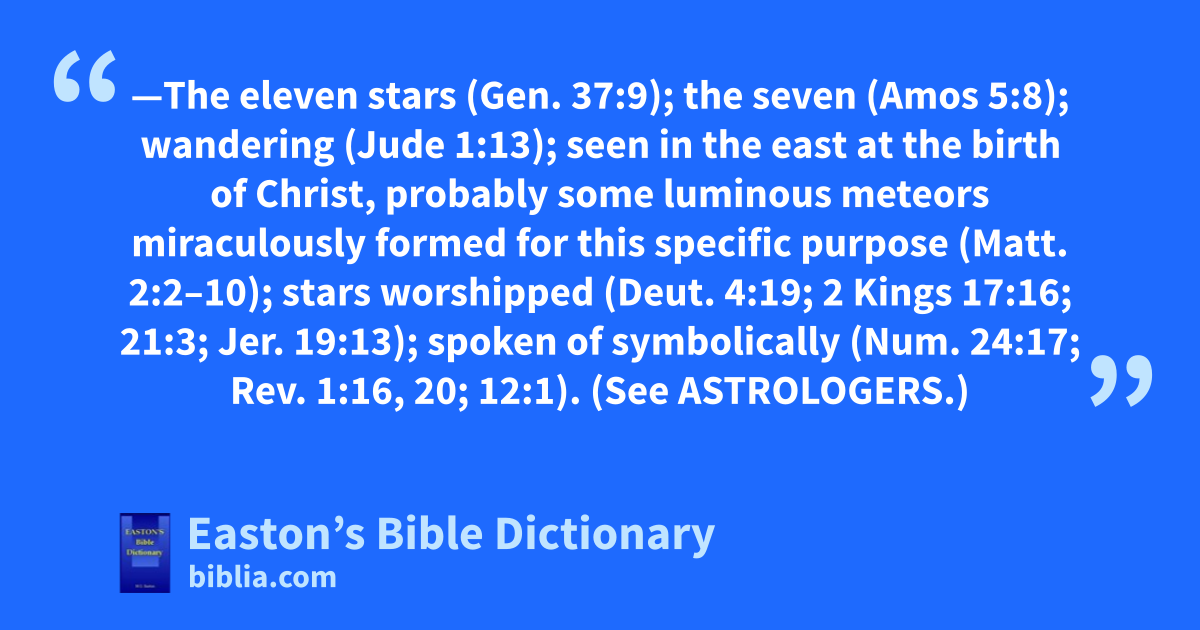 Stars—The eleven stars (Gen. 37:9); the seven (Amos 5:8); wandering (Jude 1:13); seen in the east at the birth of Christ, probably some luminous meteors miraculously formed for this specific purpose (Matt. 2:2–10); stars worshipped (Deut. 4:19; 2 Kings 17:16; 21:3; Jer. 19:13); spoken of symbolically (Num. 24:17; Rev. 1:16, 20; 12:1). (See ASTROLOGERS.)