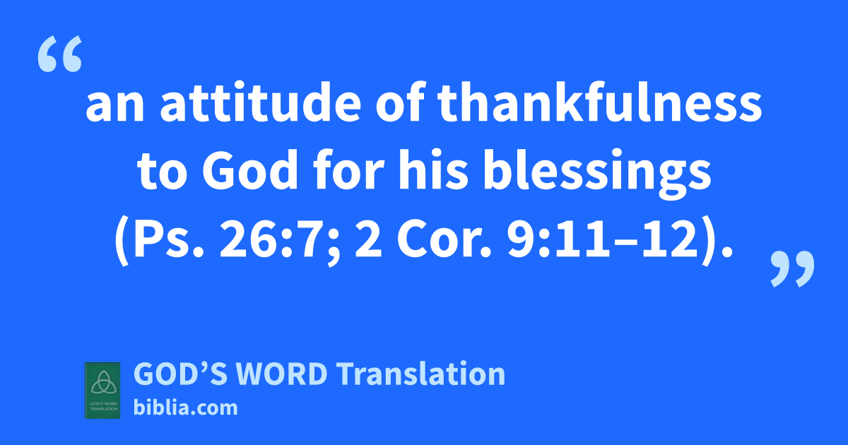 thanksgiving an attitude of thankfulness to God for his blessings (Ps. 26:7; 2 Cor. 9:11–12).
