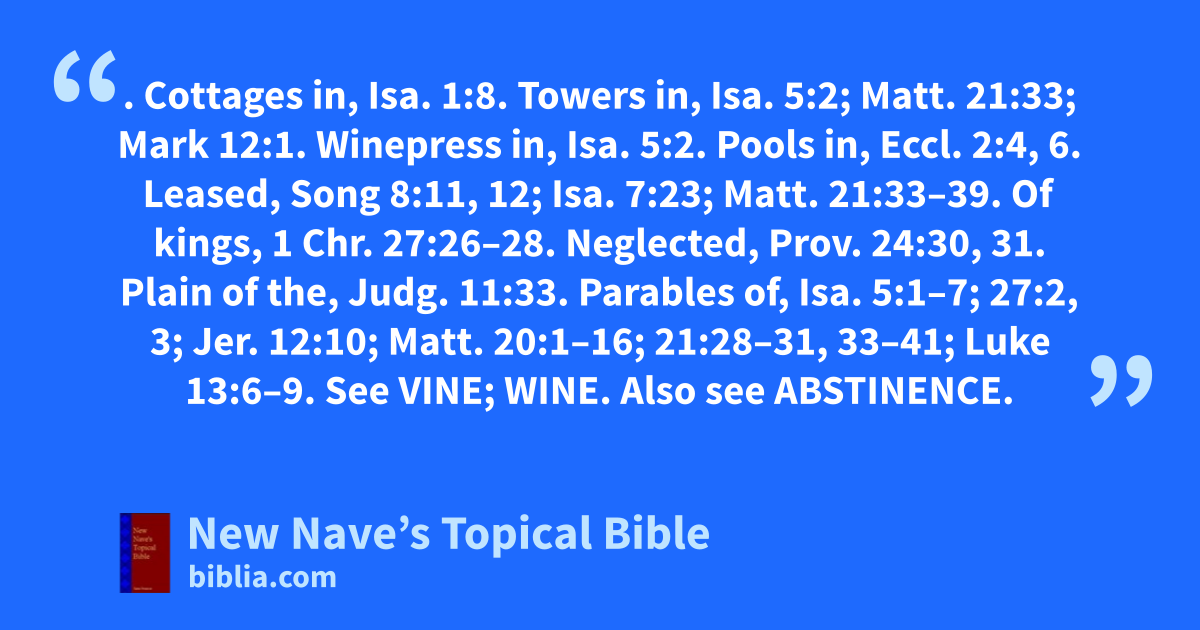 VINEYARD. Cottages in, Isa. 1:8. Towers in, Isa. 5:2; Matt. 21:33; Mark 12:1. Winepress in, Isa. 5:2. Pools in, Eccl. 2:4, 6. Leased, Song 8:11, 12; Isa. 7:23; Matt. 21:33–39. Of kings, 1 Chr. 27:26–28. Neglected, Prov. 24:30, 31. Plain of the, Judg. 11:33. Parables of, Isa. 5:1–7; 27:2, 3; Jer. 12:10; Matt. 20:1–16; 21:28–31, 33–41; Luke 13:6–9. See Vine; Wine. Also see Abstinence.