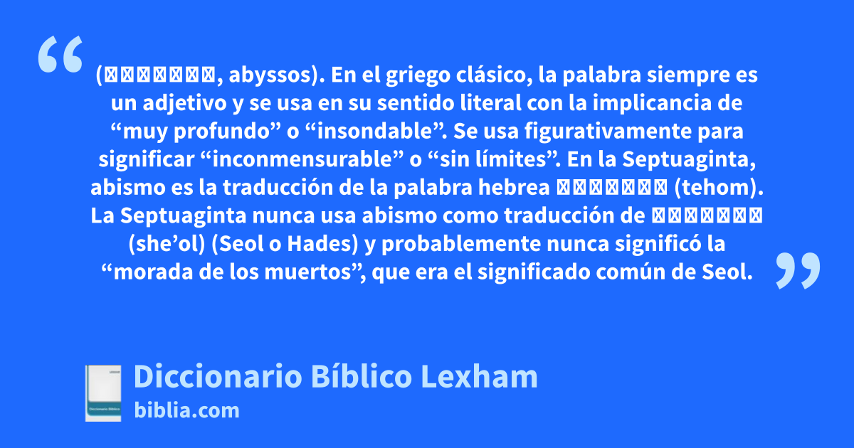 Abismo (ἄβυσσος, abyssos). En el griego clásico, la palabra siempre es un adjetivo y se usa en su sentido literal con la implicancia de “muy profundo” o “insondable”. Se usa figurativamente para significar “inconmensurable” o “sin límites”.